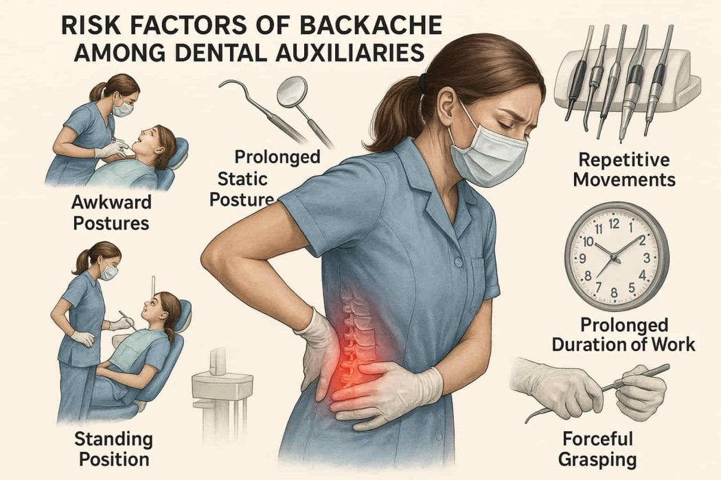 Background: Occupational health issues, particularly musculoskeletal disorders (MSDs), are prevalent worldwide. Dental auxiliaries are prone to backache due to prolonged static postures and repetitive movements, affecting their productivity and quality of life. Objective: To determine the prevalence of backache among dental auxiliaries in Islamabad and Rawalpindi and analyze the associated risk factors. Methods: A cross-sectional study was conducted using a self-administered, validated questionnaire distributed among 80 dental auxiliaries in hospitals and private clinics. The variables assessed included work posture, specialty, working hours, years in practice, and absenteeism due to pain. Data were analyzed using SPSS version 17, with chi-square tests applied to determine associations between back pain and independent variables. Results: Out of 80 distributed questionnaires, 60 (75%) were completed. Among participants, 78.3% were males and 21.7% females. The overall prevalence of back pain was 65%. Among affected participants, 58.3% reported bearable pain, 1.7% experienced severe pain, and 5% did not specify. The only factor significantly associated with back pain was specialty (endodontics/operative department, p = 0.04). Other factors, including posture, years in practice, working hours, and exercise, did not show significant associations. Conclusion: A high prevalence of back pain was observed among dental auxiliaries in Pakistan. Ergonomic interventions, targeted training, and workplace modifications are essential to mitigate occupational health risks.